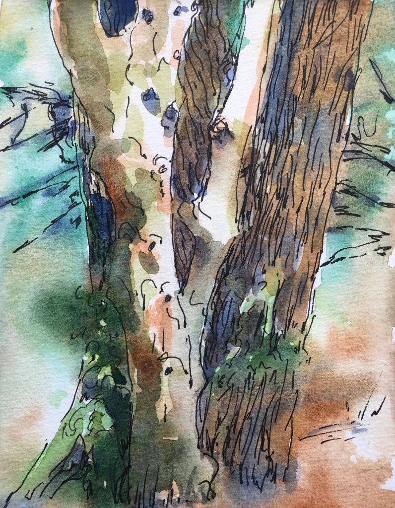Summer is a busy time but I didn’t want to pass up a chance to walk together in July. So, we will start early (9:30am) from Reigate Heath Car Park. This walk heads through the woods at the North end of the Heath (past the spot where I made this sketch) and out through fields to join the Greensand Way. We then head south to the River Mole and loop back to the car Park.